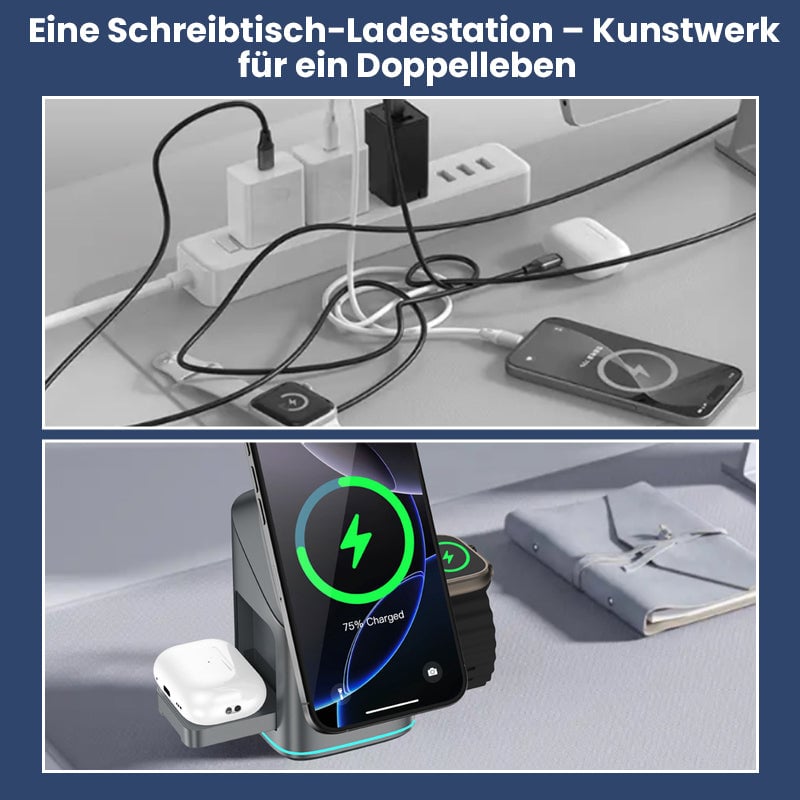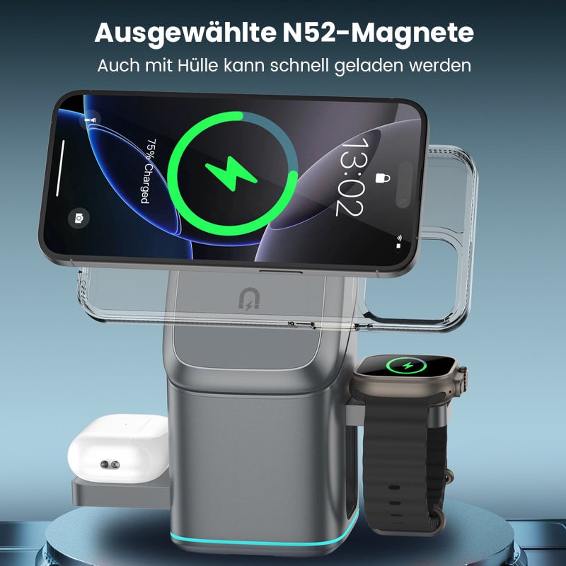 Ich liebe es, wie ich mein Handy, meine Ohrhörer und meine Smartwatch gleichzeitig aufladen kann. Das magnetische drahtlose Laden ist so schnell, und die versteckten Fächer sind perfekt, um meinen Schreibtisch ordentlich zu halten!