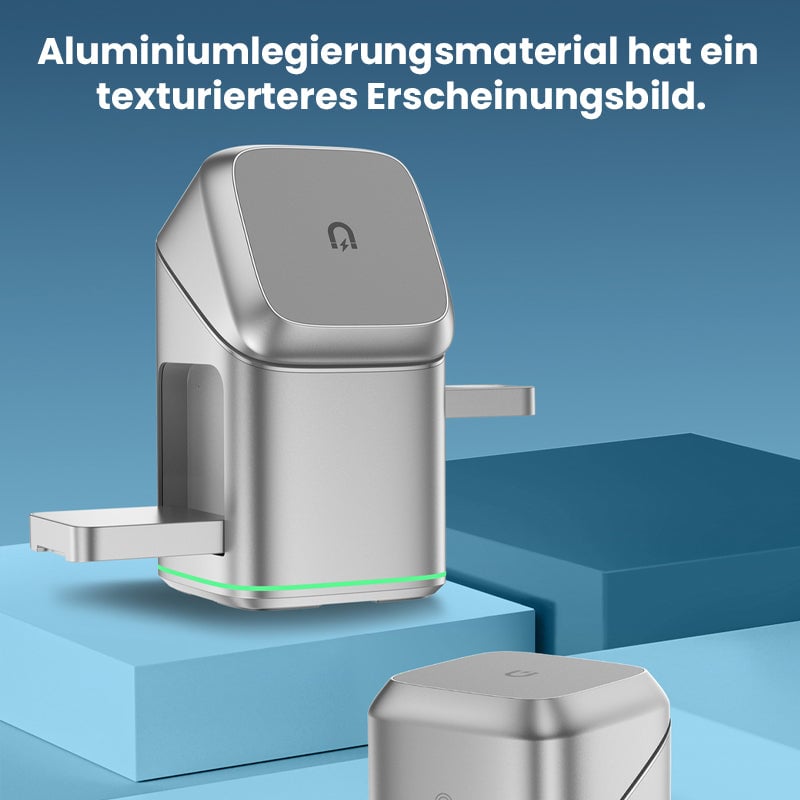Der minimalistische Metallkörper sieht fantastisch auf meinem Schreibtisch aus. Es ist nicht nur funktional, sondern verleiht meinem Arbeitsplatz auch eine elegante Note. Außerdem sind die rotierenden Ladepods ein echter Game-Changer!